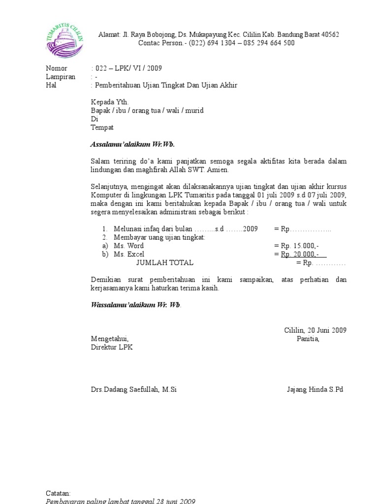 | Lihat Contoh Surat Pemberitahuan Ujian Semester Sekolah Dan Pelunasan Pembayaran |